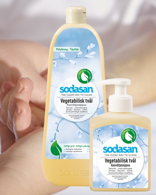 Sodasan tvål tillverkas av ekologiska vegetabiliska oljor som rengöringssubstans istället för starkt uttorkande tensider. Det har hjälpt många som kämpar med känslig hud, allergi och eksem. Lämplig också för barn, vars hud är känsligare än vuxnas.